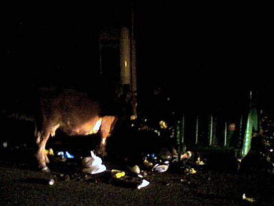 Η παραπάνω φωτογραφία τραβήχτηκε χθες το βραδύ στην περιοχή του Αίπους λίγο μετα τους αναμεταδότες και λίγο πριν το τουριστικό χωριό. Απεικονείζεται μια αγελάδα (που φέρει πάνω της όλα τα διακριτικά που την καθιστούν μελλοντικό ντόπιο – αγνό κρέας ή γάλα) να τρέφεται από τα σκουπίδια που έχουν πέσει έξω από τον κάδο των σκουπιδιών.