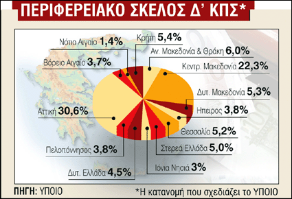 ΣΕ ΑΤΤΙΚΗ και Κεντρική Μακεδονία κατανέμεται περίπου το 60% των πόρων (5,5 δισ. ευρώ από τα 8,8 δισ. ευρώ) που διατίθενται μέσω του Ευρωπαϊκού Ταμείου Περιφερειακής ανάπτυξης και του Ευρωπαϊκού Κοινωνικού Ταμείου, σύμφωνα με την πρόταση του υπουργείου Oικονομίας για το Δ’ ΚΠΣ. Σε μία Ελλάδα «δύο ταχυτήτων» παραπέμπει η κατανομή των πόρων του Δ’ ΚΠΣ για τις 13 περιφέρειες της χώρας όπως αυτές θα παρουσιαστούν στο 3ο αναπτυξιακό συνέδριο που θα γίνει για το σχεδιασμό του Εθνικού Σχεδίου Περιφερειακής Ανάπτυξης (ΕΣΠΑ) 2007-2013.