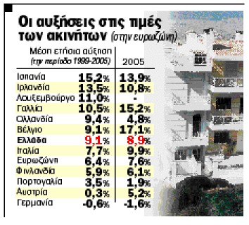 ΥΨΗΛΟΤΕΡΕΣ από τον μέσο ρυθμό στην ευρωζώνη ήταν οι αυξήσεις τιμών των ακινήτων στην Ελλάδα την περίοδο 1999 – 2005. Η έκθεση της Ευρωπαϊκής Κεντρικής Τράπεζας δείχνει ότι τη συγκεκριμένη περίοδο οι αυξήσεις στην Ελλάδα «έτρεχαν» με μέσο ετήσιο ρυθμό 9,1%, έναντι 6,4% του μέσου ευρωπαϊκού. Υπήρχαν φυσικά και χώρες με μεγαλύτερες ετήσιες αυξήσεις από ό,τι η Ελλάδα, όπως η Ολλανδία (9,4%), η Γαλλία (10,5%), το Λουξεμβούργο (11%), η Ιρλανδία (13,5%), ενώ «πρωταθλήτρια» στις ανατιμήσεις αναδεικνύεται η κτηματαγορά της Ισπανίας με 15,2%.