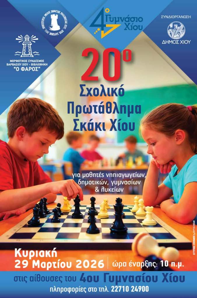 Ο Μορφωτικός Σύνδεσμος Βαρβασίου Χίου Βιβλιοθήκη “ο Φάρος” και ο Σκακιστικός Όμιλος Παναγίας Καλλιμασιάς Χίου σε συνεργασία με το 4ο Γυμνάσιο Χίου και με τη στήριξη του Δήμου Χίου διοργανώνουν το 20ο Σχολικό Πρωτάθλημα Σκάκι Χίου 2026.