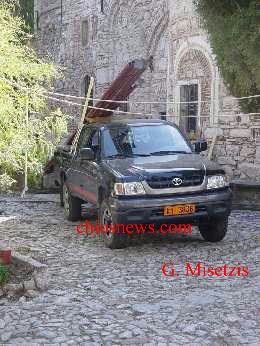 Την είδηση και τη φωτογραφία μας μετέφερε ο εκδότης του “Σύγχρονου Λόγου” Γιώργος Μισετζής που πέτυχε το υπηρεσιακό φορτηγάκι την ώρα που φόρτωνε τις σκαλωσιές. Έτσι για να το χαίρονται και οι δύο μοναχοί που μένουν στο μοναστήρι και βαρέθηκαν να το βλέπουν με το νάιλον.