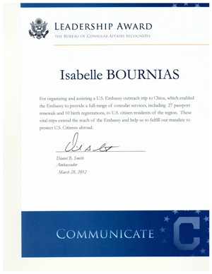 Με την ανώτατη τιμητική διάκριση «Ηγεσίας» τιμήθηκε η Πρόεδρος της Ένωσης Ομογενών Χίου και τέως Νομαρχιακή Σύμβουλος Χίου κα Ισαβέλλα Μπουρνιά, την Τετάρτη 28 Μαρτίου 2012, στην Αμερικανική Πρεσβεία Αθηνών.