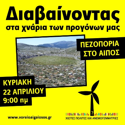 Οι “Χιώτες Πολίτες και Ανεμογεννήτριες” σας προσκαλούν την Κυριακή 22 Απριλίου σε “πεζοπορία – περιήγηση στα χνάρια των προγόνων μας”. Οδηγός μας θα είναι ο Γιώργος Χαλάτσης.