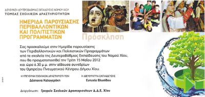 Η Διεύθυνση Δευτεροβάθμιας Εκπαίδευσης Χίου διοργανώνει Ημερίδα παρουσίασης των Περιβαλλοντικών και Πολιτιστικών Προγραμμάτων που υλοποιήθηκαν κατά το σχολικό έτος 2011-12 την Τρίτη 15 Μαΐου 2012 και ώρα 18.30 στην αίθουσα συνεδρίων του Ομηρείου Πνευματικού Κέντρου Δήμου Χίου.H εκδήλωση θα είναι ανοιχτή στο κοινό.