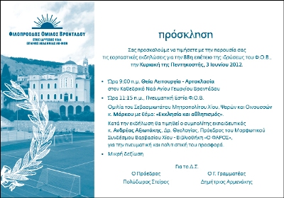 Ο Φιλοπρόοδος Όμιλος Βροντάδου πραγματοποιεί εορταστικές εκδηλώσεις για την 88η επέτειο της ιδρύσεως του,την Κυριακή της Πεντηκοστής, 3 Ιουνίου 2012.