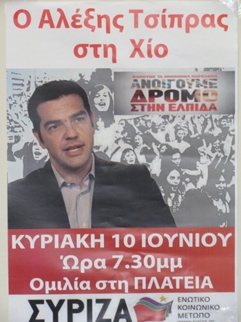 Κατά τη διάρκεια συνέντευξης τύπου, μισή ώρα πριν το μεσημέρι στην αίθουσα του Δημοτικού Συμβουλίου Δήμου Χίου, ανακοινώθηκε εξάλλου ότιτην Κυριακή  10 Ιουνίου θα επισκεφθεί τη Χίο ο Αλέξης Τσίπρας που στις 7.30 μ.μ. θα μιλήσει στην πλατεία Βουνακίου.