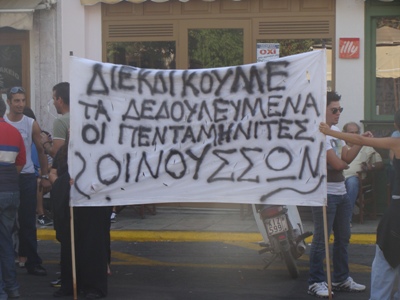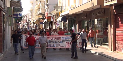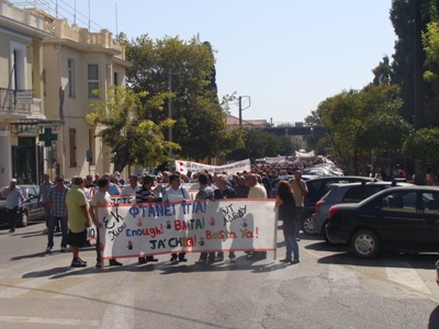 Αντίθετα η πορεία των σωματείων ακολούθησε το συνηθισμένο δρομολόγιο δηλαδή γύρω από τη πλατεία, προκυμαία με στάση κάτω από το γραφείο του βουλευτή της ΝΔ και υπουργού Ναυτιλίας Κωστή Μουσουρούλη και στη συνέχεια στο ύψος του πολιτικού γραφείου του βουλευτή του ΠΑΣΟΚ Κώστα Τριαντάφυλλου.