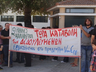 απεργία, πανό εργαζομένων στα προγράμματα κοινωφελούς εργασίας