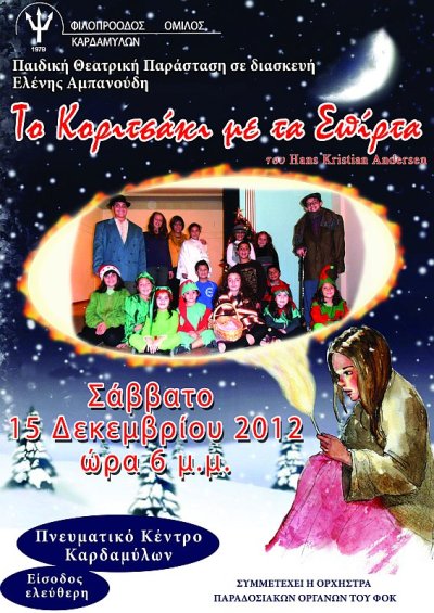 Το παιδικό θεατρικό εργαστήρι του Φιλοπρόοδου Ομίλου Καρδαμύλων παρουσιάζει την παιδική θεατρική παράσταση ‘Το Κοριτσάκι με τα Σπίρτα’ του Χανς Κρίστιαν Άντερσεν σε διασκευή της Ελένης Αμπανούδη στο Πνευματικό Κέντρο Καρδαμύλων στις 15 Δεκεμβρίου, στις 6.00 μ.μ..