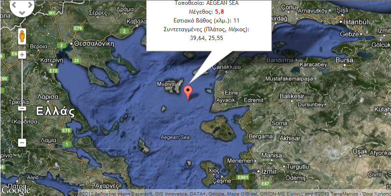 Σύμφωνα εξάλλου με το Ευρωμεσογειακό Ινστιτούτο, ο σεισμός ήταν έντασης 5,8 βαθμών στην κλίμακα Ρίχτερ στις 16.16 με εστιακό βάθος 10 χιλιόμετρα, σε θαλάσσια περιοχή 194 χλμ βορειοδυτικά της Σμύρνης,