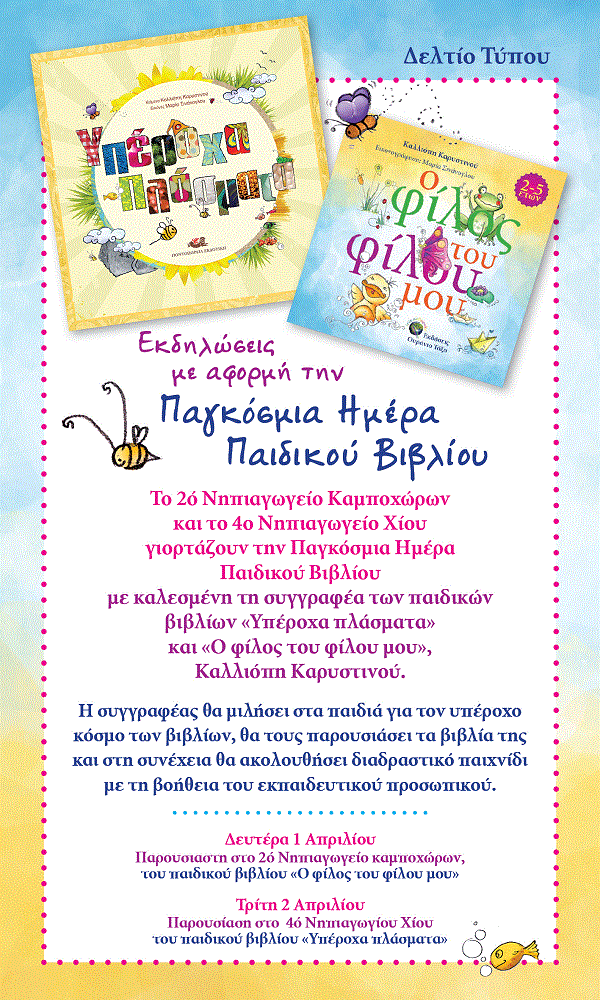 Η συγγραφέας παιδικών βιβλίων Καλλιόπη Καρυστινού, είναι προσκεκλημένη του 2ου Νηπιαγωγείου Καμποχώρων και 4ου Νηπιαγωγείου Χίου, στα πλαίσια των εκδηλώσεων για την Παγκόσμια Μέρα παιδικού βιβλίου, που εορτάζεται στις 2 Απριλίου ημέρα γέννησης του μεγάλου παραμυθά Χανς Κρίστιαν Άντερσεν .