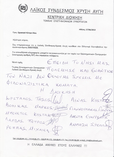 Χειρόγραφα πάνω στο συνοδευτικό έγγραφο της επιστολής, υπογράφουν όλα τα μέλη του ΔΣ.. του Εργατικού Κέντρου Χίου και δίνουν την εξής απάντηση στη Χρυσή Αυγή: