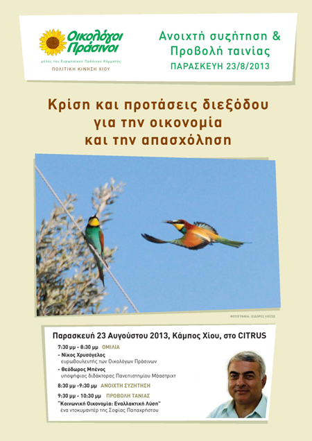 Θέμα της συζήτησης «Κρίση και προτάσεις διεξόδου για την οικονομία και την απασχόληση», στις 7.30 μ.μ. στο Περιβόλι στον Κάμπο της Χίου.