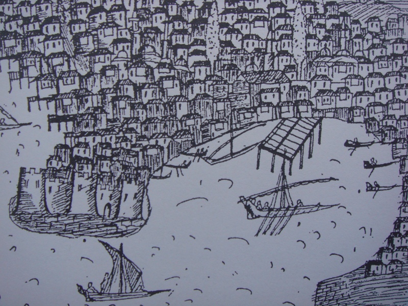 Στις φωτογραφίες εικονίζονται αναπαραστάσεις του Κρομμυδόκαστρου από το Μουσείο του Εμπορικού Επιμελητηρίου Σμύρνης και από το Isolario του Francesco Lupazzolo (1638).