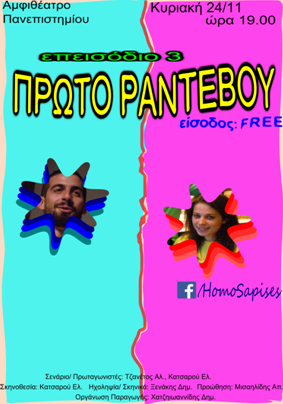 Σας προσκαλούμε όλους στο Αμφιθέατρο του Πανεπιστημίου την Κυριακή 24 Νοεμβρίου, στις 19.00 να παρακολουθήσετε την καινούργια μας δουλειά! Οπλιστείτε με την καλύτερή σας διάθεση, πάρτε έναν φίλο/μια φίλη και σας περιμένουμε να γνωριστούμε και από κοντά! Μην ξεχάσετε να κάνετε like στη σελίδα μας για να ενημερώνεστε και να παρακολουθείτε τις εξελίξεις της ομάδας, facebook.com/homosapises