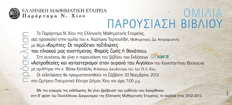 Την τιμητική τους έχουν σήμερα τα… άστρα στο ΟΜΗΡΕΙΟ, όπου το Παράρτημα Χίου της Ελληνικής Μαθηματικής Εταιρείας διοργανώνει εκδήλωση με θέμα τους Κομήτες και τις Αστροθεσίες.