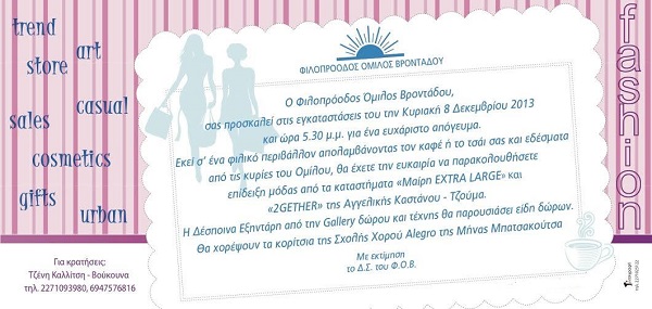 O Φιλοπρόοδος Όμιλος Βροντάδου προσκαλεί στις εγκαταστάσεις του την Κυριακή 8 Δεκεμβρίου 2013 και ώρα 5.30 μ.μ. για ένα ευχάριστο απόγευμα.