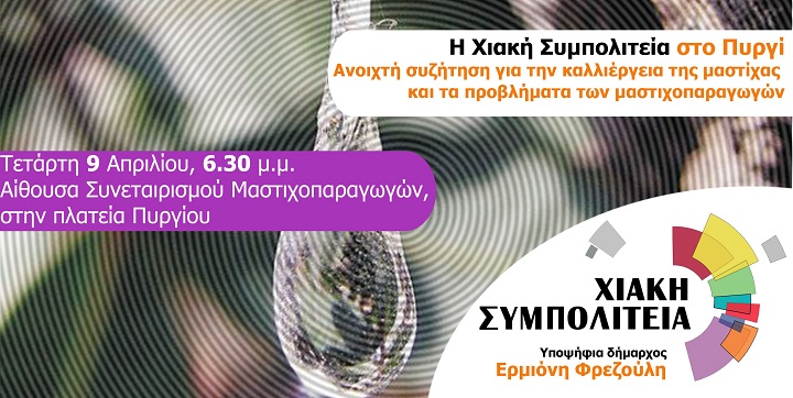 Η μαστίχα, η ΕΜΧ, οι προοπτικές της μαστιχοκαλλιέργειας θα είναι το κύριο θέμα της συνάντησης διαλόγου που διοργανώνει την Τετάρτη 9 Απριλίου η δημοτική παράταξη με επικεφαλής την Ερμιόνη Φρεζούλη. Η ειδικά σχεδιασμένη διαδικασία θα λάβει χώρα στις 6:30 το απόγευμα της Τετάρτης στην αίθουσα του Συνεταιρισμού Μαστιχοπαραγωγών στην πλατεία στο Πυργί.