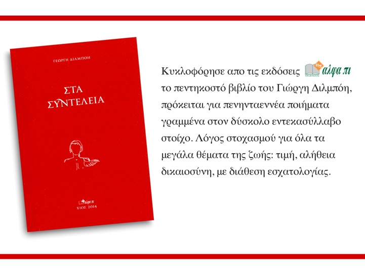 Αρχική Πολιτισμός Βιβλία Γιώργος Διλμπόης: ΣΤΑ ΣΥΝΤΕΛΕΙΑ- κυκλοφόρησε το 50ο βιβλίο! ΠολιτισμόςΒιβλία Γιώργος Διλμπόης: ΣΤΑ ΣΥΝΤΕΛΕΙΑ- κυκλοφόρησε το 50ο βιβλίο! 7 Μαΐου 2014 33 Διαφήμιση