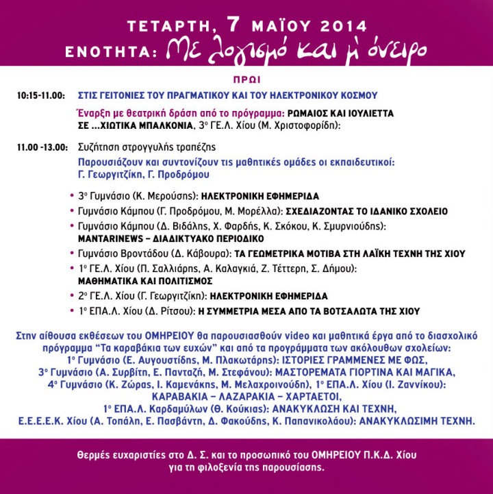 Ο Τομέας Σχολικών Δραστηριοτήτων της Διεύθυνσης Δευτεροβάθμιας Εκπαίδευσης Χίου με τη συνεργασία των εκπαιδευτικών και των μαθητικών ομάδων Γυμνασίων, Γενικών Λυκείων και ΕΠΑ.Λ. του νησιού μας, παρουσιάζει διασχολική εκδήλωση προγραμμάτων αγωγής υγείας, περιβαλλοντικής και αισθητικής αγωγής, η οποία φιλοξενείται στο Ομήρειο Πνευματικό Κέντρο Δήμου Χίου από την Παρασκευή, 2, Σάββατο, 3, Τρίτη, 6 έως και την Τετάρτη, 7 Μαΐου 2014.