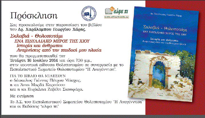 Το βιβλίο του Δρ. Χαραλάμπου Γ. Χάρης το γένος Μαρδά και Κρουσουλούδη (Πατσελύκου) με τον τίτλο “Σκλαβιά – Θολοποτάμι. Ένα ειδυλλιακό μέρος της Χίου – Ιστορία και Άνθρωποι – Αναμνήσεις από την παιδική μου ηλικία”, συμπληρώνει δύο κενά που αφορούν μια από τις πιο όμορφες και ιστορικές τοποθεσίες της Χίου, τα Σκλαβιά, κοντά στο Θολοποτάμι. Την Τετάρτη 16 Ιουλίου στις 7.30 μ.μ. η παρουσίαση στην κοινοτική αίθουσα Θολοποταμίου.