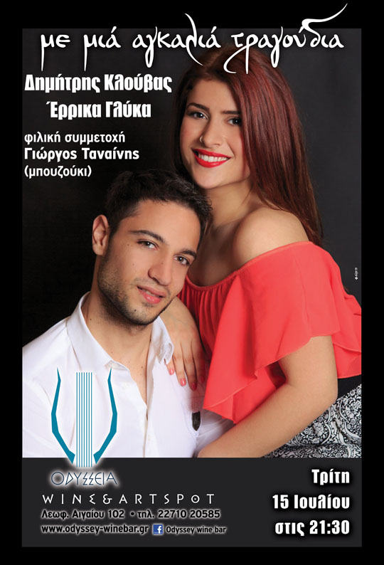 Ο Δημήτρης Κλούβας και η Έρρικα Γλύκα είναι δυό νέοι ταλαντούχοι πολλά υποσχόμενοι μουσικοί απ τη Χίο που θα ταξιδέψουν τους θαμώνες του ΟΔΥΣΣΕΙΑ wine- barσε πέλαγα ονειρικά με μοναδική ευαισθησία και διάθεση καλοκαιρινής αύρας την Τρίτη, 15 Ιουλίου στις 21.30.
