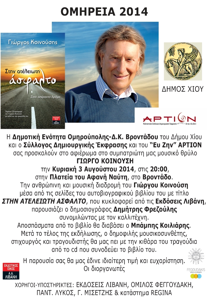 Μέσα από την παρουσίαση της αυτοβιογραφίας του “Στην Ατελείωτη Ασφαλτο’, η Δημοτική Ενότητα Ομηρούπολης θα τον τιμήσει στη σχετική εκδήλωση που θα γίνει στις 3 Αυγούστου στην πλατεία του Αφανή Ναύτη στα πλαίσια των εξδηλώσεων ΟΜΗΡΕΙΑ 2014 και με την παρουσία του ίδιου του καλλιτέχνη.