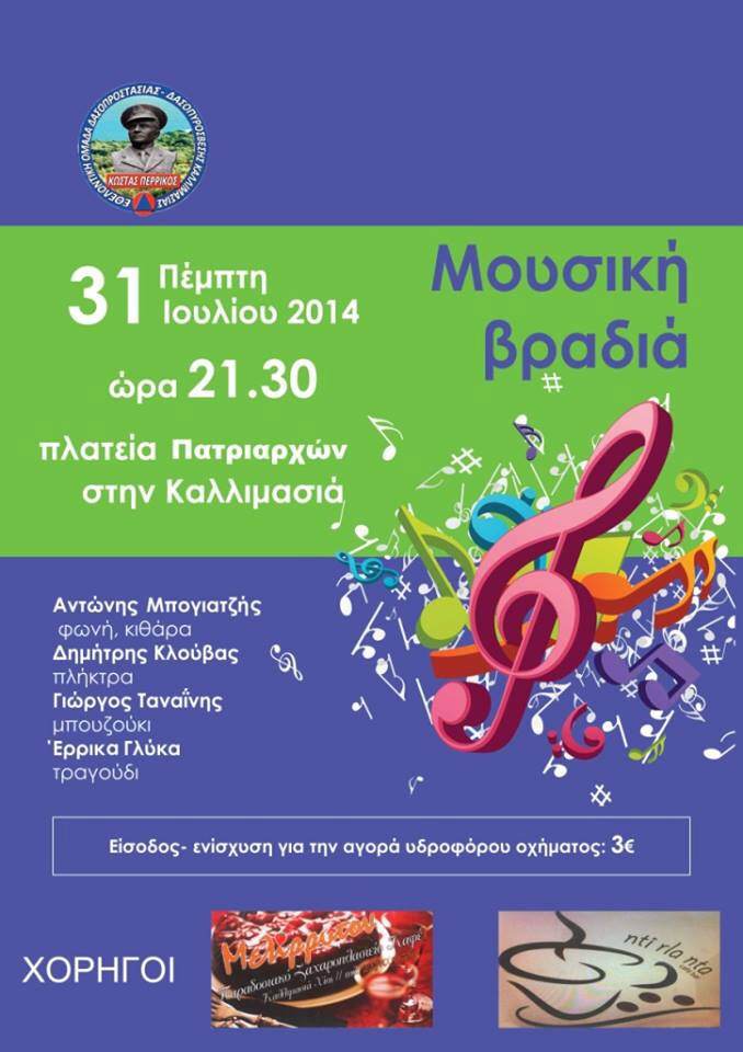 Μουσική βραδιά με σκοπό την ενίσχυση της Εθελοντικής Ομάδας Δασοπροστασίας- δασοπυρόσβεσης Καλλιμασιάς για την αγορά υδροφόρου οχήματος, διοργανώνει η εν λόγω ομάδα στις 31/7, στην πλατεία Πατριαρχών στην Καλλιμασιά.