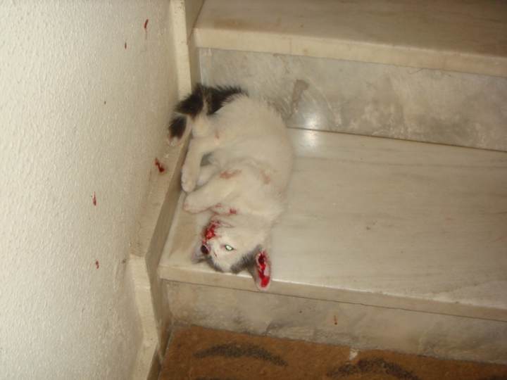 “Βγήκαν από τα διαμερίσματα τους από τις στριγκλιές ενός γατιού το οποίο χτυπούσε ένα παιδί, οκτώ χρονών περίπου, με κίτρινη μπλούζα και γκρι παντελόνι, όπως είπαν. Έφυγε τρέχοντας μόλις άνοιξαν οι πρώτες πόρτες. Η είσοδος της πολυκατοικίας θύμιζε τόπο εγκλήματος από τα αίματα. Ένα ακόμα γατί σε κατάσταση σοκ είχε κουρνιάσει σε μια γωνιά του κλιμακοστασίου. Τα γατιά για να μην επιτεθούν στον ανήλικο δολοφόνο ήταν ήμερα, είτε γιατί τα γνώριζε από το σπίτι του, είτε γιατί του τα χάρισαν κάποιοι για να τα ξεφορτωθούν. Το κουτί που τα μετέφερε και το οποίο παράτησε στην είσοδο της πολυκατοικίας είχε οπή εξαερισμού γεγονός που σημαίνει πως όποιος του τα έδωσε προετοίμασε το κουτί για μεταφορά.