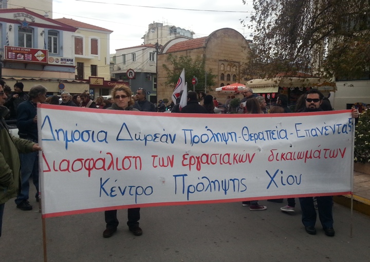 Στη συγκέντρωση του ΠΑΜΕ το λόγο πήραν εκπρόσωπος του Συλλόγου Φοιτητών του Τμήματος Ναυτιλίας, εκπρόσωπος του Σωματείου Εφοριακών, εκπρόσωπος του Σωματείου Οικοδόμων Χίου και μέλος της Διοίκησης του Σωματείου Ιδιωτικών Υπαλλήλων Χίου
