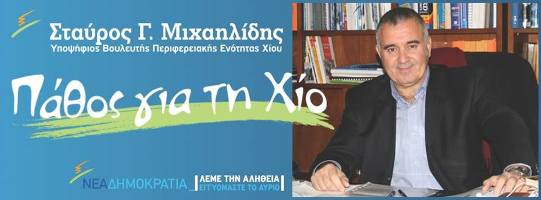 Ο Σταύρος Μιχαηλίδης, υποψήφιος βουλευτής Χίου με τη Νέα Δημοκρατία, πραγματοποιεί την κεντρική προεκλογική του συγκέντρωση, την Πέμπτη, 22 Ιανουαρίου 2015 και ώρα 7.00 μ.μ. στο ξενοδοχείο Χανδρής.