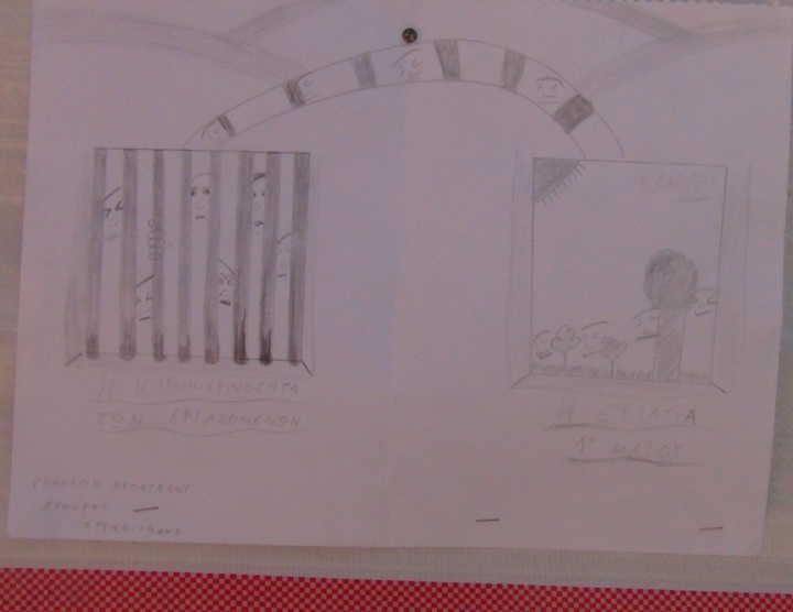 Στη φωτογραφία το έργο που κατά το chiosnews.com πήρε το βραβείο… κοινού, αφού συζητήθηκε περισσότερο από όσους πλησίασαν τα πανό που ήταν εκτεθειμένα τα έργα των παιδιών. Για την αμεσότητα του μηνύματος, αλλά και το πώς ένα παιδί δημοτικού βλέπει τον καθημερινό αγώνα των γονιών του.