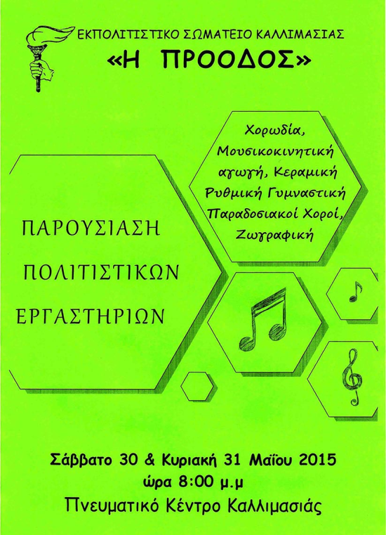 Το πολιτιστικό σωματείο Καλλιμασιάς “ΠΡΟΟΔΟΣ” παρουσιάζει τα εργαστήρια του σε ένα διήμερο εκδηλώσεων Σάββατο 30 Μαΐου και Κυριακή 31 Μαΐου 2015 ώρα 8:00 μ.μ στην αίθουσα του συλλόγου μας στην Καλλιμασιά. Χορωδία, μουσικοκινητική αγωγή, κεραμική, ζωγραφική, ρυθμική γυμναστική, παραδοσιακοί χοροί.