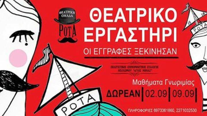 Ο Πολιτιστικός Επιμορφωτικός Σύλλογος Νεοχωρίου « ‘Άγιος Μηνάς» ανακοινώνει ότι με την έναρξη της νέας περιόδου η θεατρική του ομάδα ΡΟΤΑ ξεκινάει ένα νέο ταξίδι στον κόσμο της τέχνης του θεάτρου.