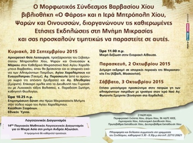 Ο Μορφωτικός Σύνδεσμος Βαρβασίου Χίου-Βιβλιοθήκη «Ο Φάρος» και η Ιερά Μητρόπολη Χίου, Ψαρών και Οινουσσών διοργανώνουν τις ετήσιες εκδηλώσεις στη Μνήμη Μικρασίας στον Καθεδρικό Μικρασιατικό Ιερό Ναό του Αγίου Χαραλάμπους στο Βαρβάσι της Χίου, την Κυριακή 20 Σεπτεμβρίου.