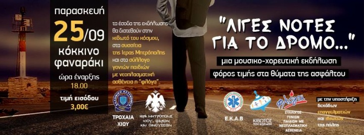 Τιμή στα θύματα της ασφάλτου και κοινωνικό μήνυμα για προσεκτικότερη οδήγηση, αποδίδουν φορείς του νησιού μέσα από μουσικοχορευτική εκδήλωση με τίτλο «Λίγες νότες για το δρόμο».