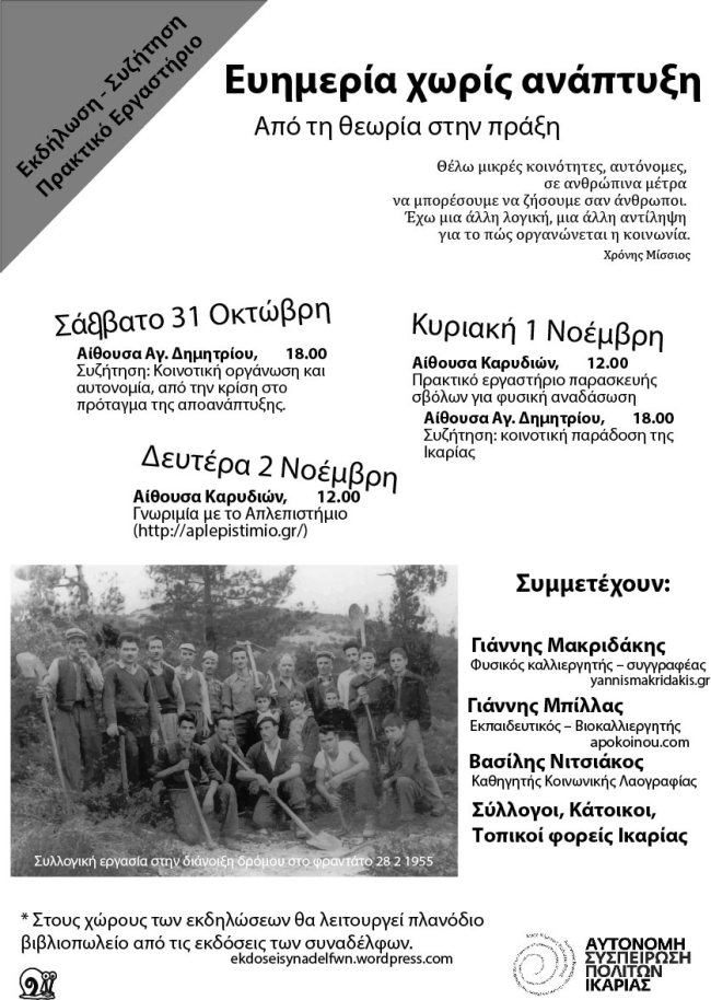 Ο Δήμος Χίου να διαθέσει ένα αγρόκτημα ιδιοκτησίας του, πέριξ της πόλης, εντός του οποίου θα φροντίσω προσωπικά και δίχως χρηματική αμοιβή να οργανώσω σε βάθος χρόνου και με όσους δημότες ενδιαφέρονται να συμμετέχουν αλλά και με σχολεία ή ομάδες πολιτών, συλλόγους κ.α. ένα πρακτικό εργαστήρι επί των αξόνων της φυσικής καλλιέργειας, της φυσικής διατροφής και της φυσικής ζωής, με παράλληλο θεωρητικό εργαστήρι φιλοσοφίας επί της μετακαταναλωτικής προσέγγισης της ζωής και της κοινωνίας.
