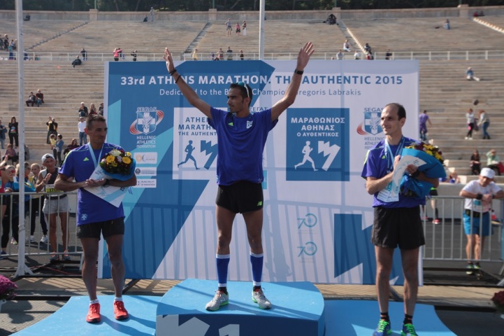 Ο έμπειρος δρομέας από την Χίο τερμάτισε σε 2 ώρες 21.22 ενάμιση περίπου μήνα από την συμμετοχή του στον Μαραθώνιο του Βερολίνου. Ο Μερούσης σημείωσε την καλύτερη επίδοση του στην κλασική διαδρομή και έδειξε πως την Ανοιξη θα είναι σε θέση να διεκδικήσει ακόμη καλύτερες επιδόσεις. Δεύτερος όπως και το 2014 ήταν ο Δημήτρης Θεοδωρακάκος με 2.27.03, στον πρώτο αγώνα του ενόψει της προσπάθειας που θα κάνει φέτος να διεκδικήσει το όριο συμμετοχής στους Ολυμπιακούς Αγώνες του Ρίο ντε Τζανέιρο. Η πρώτη τριάδα των Ανδρών έκλεισε με τον Δήμο Ευαγγελίδη με 2.27.28.