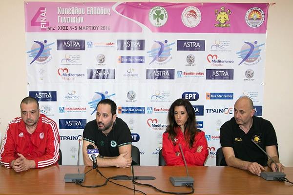 Ο προπονητής του Παναθηναϊκού, Γιώργος Ρούσης σχολίασε: «Θα ήθελα να σας πω ότι είμαι χαρούμενος που ο Παναθηναϊκός είναι παρών σε ακόμα ένα φάιναλ φορ. Έχει διπλή σημασία αυτή η διοργάνωση στη Χίο, λόγω όλων αυτών που συμβάντων στα ακριτικά νησιά με τους πρόσφυγες. Καλούμε τον κόσμο να ξεφύγει από την καθημερινότητα και να έρθει στο γήπεδο να απολαύσει βόλεϊ. Το κύπελλο δεν έχει σχέση με το πρωτάθλημα, επίσης δεν έχει σημασία τι έγινε στα προηγούμενα ματς. Ο θεσμός είναι διαφορετικός, βαραίνει και αγχώνει περισσότερο, γιατί κρίνεται τίτλος και το κίνητρο είναι μεγαλύτερο. Στόχος μας είναι ο τίτλος, ξέρουμε ότι δεν είναι εύκολο, αλλά θα τα δώσουμε όλα. Θα ήθελα οι παίκτριες μου να με εκπλήξουν και να κάνουν ένα πολύ καλό παιχνίδι. Δεν υπάρχουν μυστικά, η σεζόν έχει προχωρήσει αρκετά. Το παράπονο μου είναι ότι θα ήθελα μια φορά να ερχόμουν ως φαβορί».