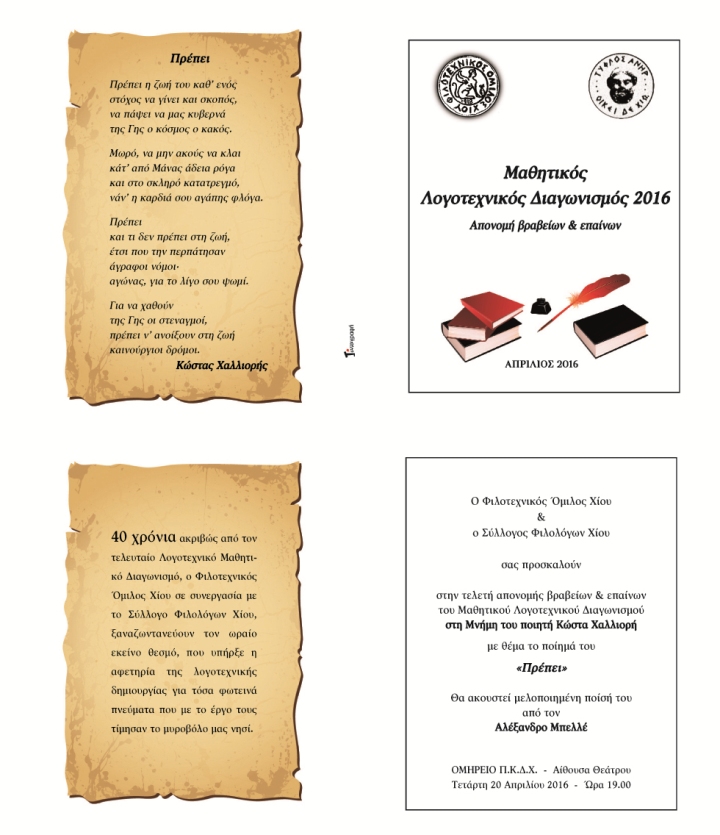 ΤΗΝ ΤΕΤΑΡΤΗ 20.4 ΚΑΙ ΩΡΑ 19.00 ΣΤΗΝ ΑΙΘΟΥΣΑ ΘΕΑΤΡΟΥ ΤΟΥ ΟΜΗΡΕΙΟΥ ΜΕΤΑ ΑΠΟ 40 ΑΚΡΙΒΩΣ ΧΡΟΝΙΑ Ο ΦΙΛΟΤΕΧΝΙΚΟΣ ΣΕ ΩΡΑΙΑ ΣΥΝΕΡΓΑΣΙΑ ΜΕ ΤΟΝ ΣΥΛΛΟΓΟ ΦΙΛΟΛΟΓΩΝ ΧΙΟΥ ΞΑΝΑΔΙΝΕΙ ΣΤΟΥΣ ΕΦΗΒΟΥΣ ΜΑΣ ΤΟ ΠΑΝΑΡΧΑΙΟ ΕΛΛΗΝΙΚΟ ΠΑΡΑΓΓΕΛΜΑ ” ΑΙΕΝ ΑΡΙΣΤΕΥΕΙΝ ” ΚΑΙ ΕΠΙΒΡΑΒΕΥΕΙ ΤΗΝ ΕΥΓΕΝΗ ΑΜΙΛΛΑ ΣΤΟ ΧΩΡΟ ΤΗΣ ΠΝΕΥΜΑΤΙΚΗΣ ΕΚΦΡΑΣΗΣ ΚΑΙ ΔΗΜΙΟΥΡΓΙΑΣ.