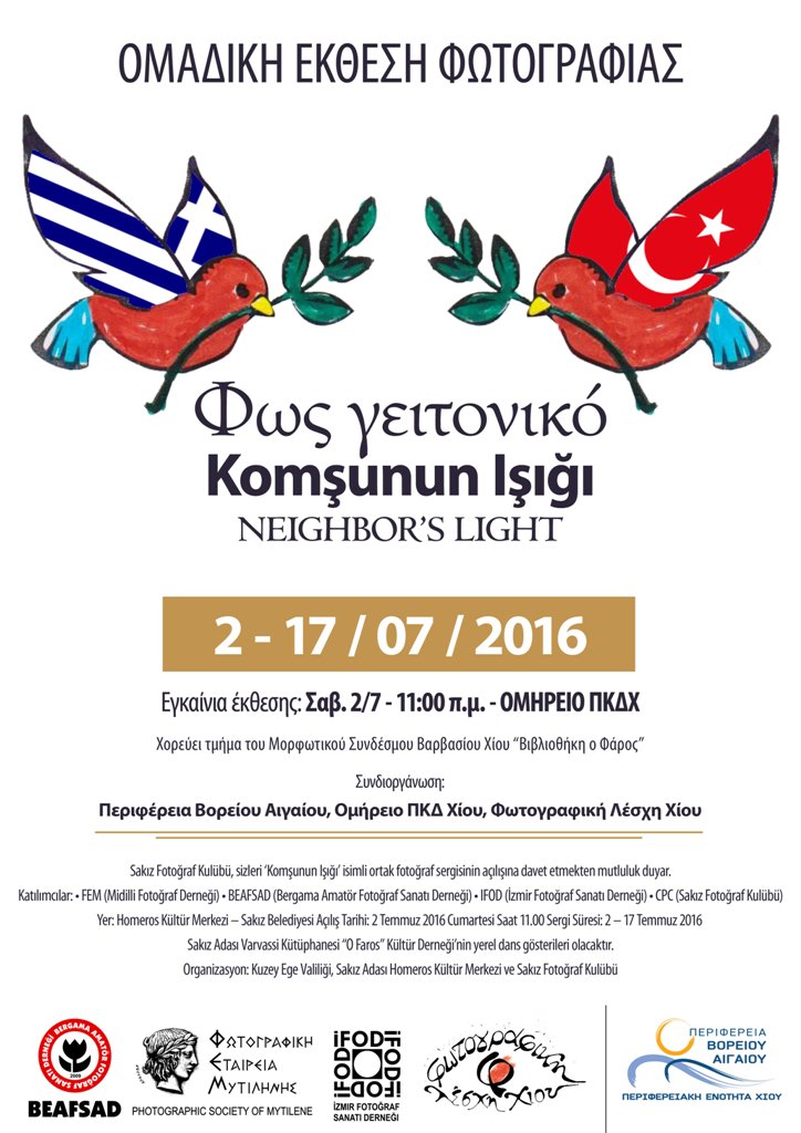 «Φως γειτονικό» ή «Komsunun Isigi» ονομάζεται η έκθεση φωτογραφίας, 4 φωτογραφικών ομάδων από ισάριθμες πόλεις σε Ελλάδα και Τουρκία, που εγκαινιάστηκε στις 2 Ιουλίου και θα διαρκέσει μέχρι τις 17/7 στο ΟΜΗΡΕΙΟ Πνευματικό Κέντρο Δήμου Χίου.