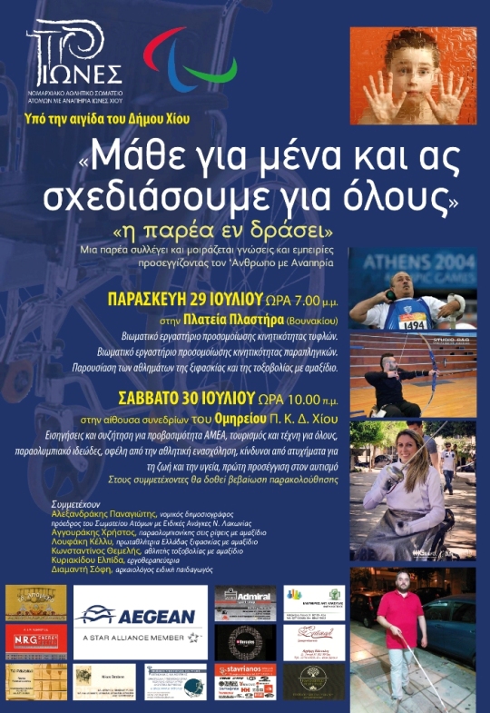 Το Νομαρχιακό Αθλητικό Σωματείο ΑμεΑ ΙΩΝΕΣ Χίου φιλοξενεί στο νησί μας την «Παρέα εν δράσει» και συνδιοργανώνουν διήμερες εκδηλώσεις την Παρασκευή 29 και το Σάββατο 30 Ιουλίου, προκειμένου να συλλέξουν και να μοιραστούν γνώση και εμπειρίες στο νησί μας. Πρόκειται για ανθρώπους που βιώνουν εκ των έσω την αναπηρία, αλλά σε κάθε ευκαιρία μεταδίδουν διαρκώς θετική ενέργεια και παροτρύνουν σε θετικές σκέψεις για το κοινό καλό, ατενίζοντας με αισιοδοξία.