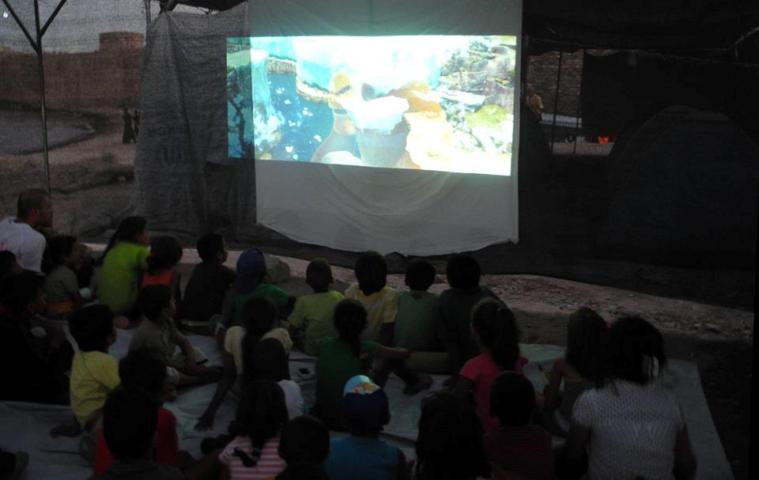 Αυτή τη βδομάδα το πρόγραμμα προβολών περιλάμβανε το «Ice Age 4», μεταγλωττισμένο στα αραβικά, που κράτησε συντροφιά σε περισσότερα από 60 παιδιά, που το παρακολούθησαν ενθουσιασμένα.