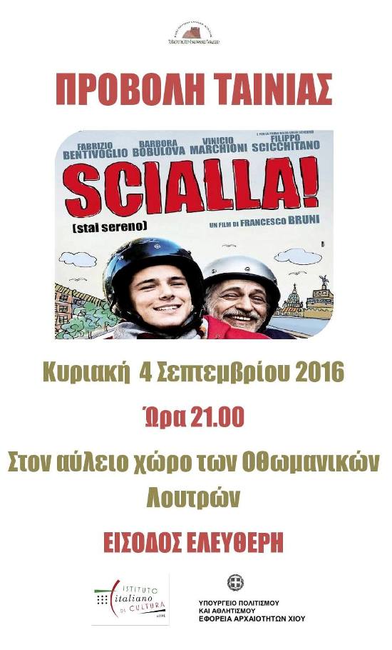 Η μαγεία του φετινού καλοκαιριού τελειώνει στο Κάστρο της Χίου με την προβολή της ταινίας «Scialla»  στον αύλειο χώρο των Οθωμανικών Λουτρών του Κάστρου της Χίου, την Κυριακή  4 Σεπτεμβρίου 2016.