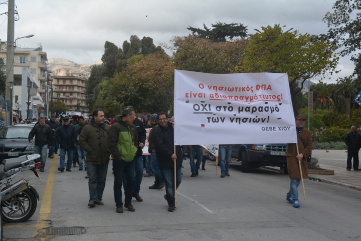 Ο κεντρικός ομιλητής στη συγκέντρωση, ο πρόεδρος της Ομοσπονδίας Επαγγελματοβιοτεχνών και Εμπόρων του νησιού Βασίλης Παππάς κάλεσε τους Χιώτες αλλά και τους άλλους νησιώτες βουλευτές να καταθέσουν τροπολογία ώστε να μην εφαρμοστεί το μέτρο από την 1η του νέου έτους, κόβοντας το τελευταίο απτό αντιστάθμισμα της Πολιτείας στη νησιωτικότητα.