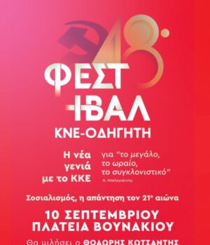 Με σύνθημα «Η νέα γενιά με το ΚΚΕ για “το μεγάλο, το ωραίο, το συγκλονιστικό” – Σοσιαλισμός, η απάντηση τον 21ο αιώνα», πραγματοποιείται φέτος το 48ο Φεστιβάλ της Κομμουνιστικής Νεολαίας Ελλάδας και της εφημερίδας της, του “Οδηγητή”.