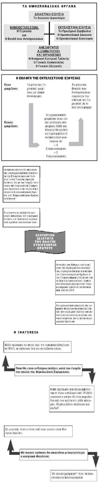Η Ενωμένη Κυπριακή Δημοκρατία Θα είναι ένα ανεξάρτητο κράτος με τη μορφή ενός συνεταιρισμού μη επιδεχόμενου διάλυσης. Θα έχει μία ομοσπονδιακή κυβέρνηση και δύο ισότιμα συνιστώντα κράτη, το Ελληνοκυπριακό Κράτος και το Τουρκοκυπριακό Κράτος. Θα είναι μέλος των Ηνωμένων Εθνών και της Ευρωπαϊκής Ένωσης. Θα έχει μία ενιαία διεθνή νομική προσωπικότητα και κυριαρχία. Η Ενωμένη Κυπριακή Δημοκρατία θα είναι οργανωμένη σύμφωνα με το Σύνταγμά της και σύμφωνα με τις βασικές αρχές του κράτους δικαίου, της δημοκρατίας, της αντιπροσωπευτικής δημοκρατικής διακυβέρνησης, της πολιτικής ισότητας των Ελληνοκυπρίων και των Τουρκοκυπρίων, της διζωνικότητας και του ισότιμου καθεστώτος των συνιστώντων κρατών, και θα είναι κοσμικού χαρακτήρα. Το Σύνταγμα της Ενωμένης Κυπριακής Δημοκρατίας: Είναι ο υπέρτατος νόμος της χώρας και θα δεσμεύει όλες τις αρχές της ομοσπονδίας και των συνιστώντων κρατών. Θα υιοθετηθεί με δημοκρατικές διαδικασίες από τους Ελληνοκυπρίους και τους Τουρκοκυπρίους σύμφωνα με τη χωριστά εκφρασθείσα κοινή τους βούληση. Η Διασφάλιση της Ενωμένης Κυπριακής Δημοκρατίας Το Σύνταγμα της Ενωμένης Κυπριακής Δημοκρατίας δύναται να τροποποιηθεί μόνο με την έγκριση του ομοσπονδιακού Κοινοβουλίου και της πλειοψηφίας των ψηφοφόρων του Ελληνοκυπριακού Κράτους και του Τουρκοκυπριακού Κράτους, έπειτα από τη διενέργεια χωριστών δημοψηφισμάτων. Τα δύο Βασικά Άρθρα του Συντάγματος τα οποία καθορίζουν την Ενωμένη Κυπριακή Δημοκρατία και τα δύο συνιστώντα κράτη δεν δύνανται να τροποποιηθούν. Το Ανώτατο Δικαστήριο θα διαφυλάσσει το Σύνταγμα της Ενωμένης Κυπριακής Δημοκρατίας και θα διασφαλίζει τον πλήρη σεβασμό του. Απαγορεύεται οποιαδήποτε μονομερής τροποποίηση της τάξης πραγμάτων που εγκαθιδρύεται με τη Θεμελιώδη Συμφωνία, ιδιαίτερα η ολική ή μερική ένωση της Κύπρου με οποιαδήποτε άλλη χώρα, ή οποιαδήποτε μορφή διχοτόμησης ή απόσχισης. Η Συνθήκη Εγκαθίδρυσης, η Συνθήκη Εγγυήσεως και η Συνθήκη Συμμαχίας θα εξακολουθούν να ισχύουν και θα εφαρμόζονται, τηρουμένων των αναλογιών, στη νέα τάξη πραγμάτων. Με την έναρξη της ισχύος της Θεμελιώδους Συμφωνίας, η Κύπρος θα υπογράψει μια Συνθήκη με την Ελλάδα, την Τουρκία και το Ηνωμένο Βασίλειο για θέματα σχετικά με τη νέα τάξη πραγμάτων στην Κύπρο, καθώς και πρόσθετα πρωτόκολλα στις Συνθήκες Εγκαθίδρυσης, Εγγυήσεως και Ασφάλειας. Η ομοσπονδιακή κυβέρνηση θα ασκεί κυριαρχικά τις εξουσίες που καθορίζει το Σύνταγμα της Ενωμένης Κυπριακής Δημοκρατίας. Οι εξουσίες αυτές θα διασφαλίζουν ότι η Ενωμένη Κυπριακή Δημοκρατία δύναται: να ομιλεί και να ενεργεί με μία φωνή διεθνώς και εντός της Ευρωπαϊκής Ένωσης, να εκπληρώνει τις υποχρεώσεις της ως κράτος-μέλος της Ευρωπαϊκής Ένωσης, και να προστατεύει την ακεραιότητα, τα σύνορα, τις πλουτοπαραγωγικές πηγές και την αρχαία κληρονομιά της. Το κάθε συνιστών κράτος θα ασκεί κυριαρχικά εντός των εδαφικών του συνόρων και εντός των ορίων του Συντάγματος της Ενωμένης Κυπριακής Δημοκρατίας όλες τις εξουσίες που δεν εκχωρούνται ρητώς στην ομοσπονδιακή κυβέρνηση. Η ομοσπονδιακή κυβέρνηση και τα συνιστώντα κράτη θα σέβονται πλήρως και δεν θα παραβιάζουν τις μεταξύ τους εξουσίες και λειτουργίες. Δεν θα υπάρχει ιεραρχία μεταξύ των ομοσπονδιακών νόμων και των νόμων των συνιστώντων κρατών. Τα συνιστώντα κράτη θα συνεργάζονται και θα συντονίζονται μεταξύ τ