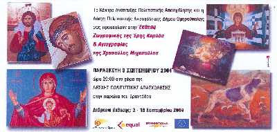 Η Λέσχη Πολιτιστικής Απασχόλησης του Δήμου Ομηρούπολης προσκαλεί στα εγκαίνια της Έκθεσης Ζωγραφικής της Έρης Καρύδα και Αγιογραφίας της Χρυσούλας Μιχοπούλου, την Παρασκευή 3 Σεπτεμβρίου 2004 και ώρα 20:00, στο χώρο της Λέσχης Πολιτιστικής Απασχόλησης, στην παραλία Βροντάδου.