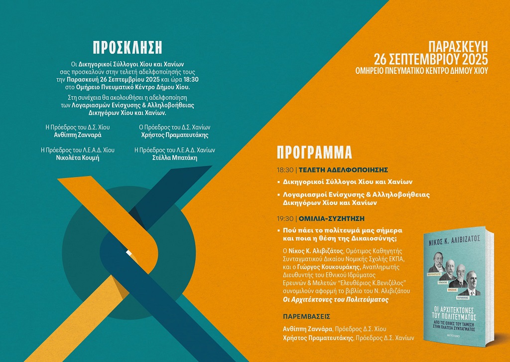 Θα υπάρξουν παρεμβάσεις από την πρόεδρο του Δικηγορικού Συλλόγου Χίου Ανθήπη Ζαννάρα και τον πρόεδρο του Δ.Σ. Χανίων Χρήστο Πραματευτάκη.