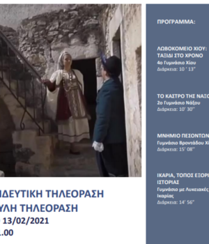 Στο αφιέρωμα του Σαββάτου, 13/2, έχουν επιλεγεί 2 ταινίες από σχολεία της Χίου (4ο Γυμνάσιο, Γυμνάσιο Βροντάδου), 1 ταινία από σχολείο της Νάξου (2ο Γυμνάσιο) και 1 ταινία από σχολείο της Ικαρίας ( Γυμνάσιο –με Λ.Τ. – Ραχών ).